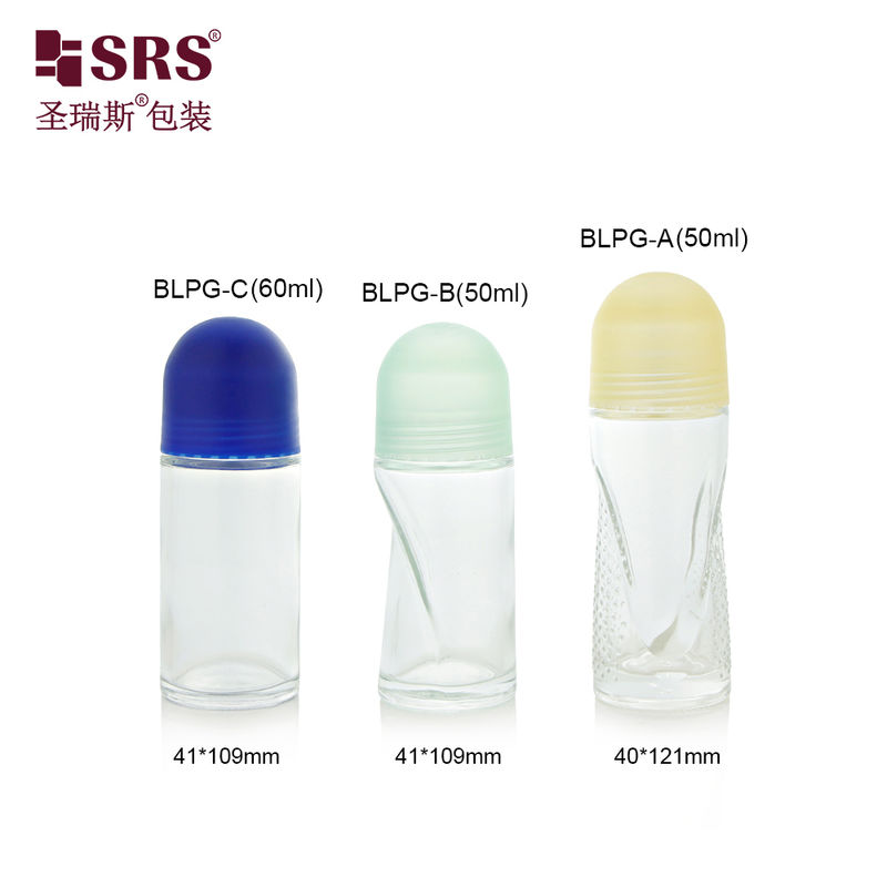 BLPG 50ml 60ml अद्वितीय आकार की खाली ग्लास रोल ऑन बोतल बॉडी डिओडोरेंट जेल एंटीपर्सपिरेंट पैकेजिंग के लिए